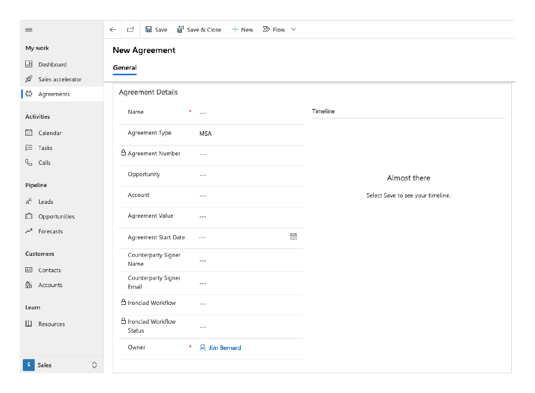 You should also update the default Form for the Agreement table, and add the Agreement table to your preferred Sales app in Dynamics so that you can easily create new Agreement records and see their status. Our example flows will also be using notes attached to the Agreement to show updates to the Ironclad workflow, so you should also add a Timeline component to the form so that those updates can be seen. As an example, the screen below shows a default form defined for the new Agreement table in Dynamics: