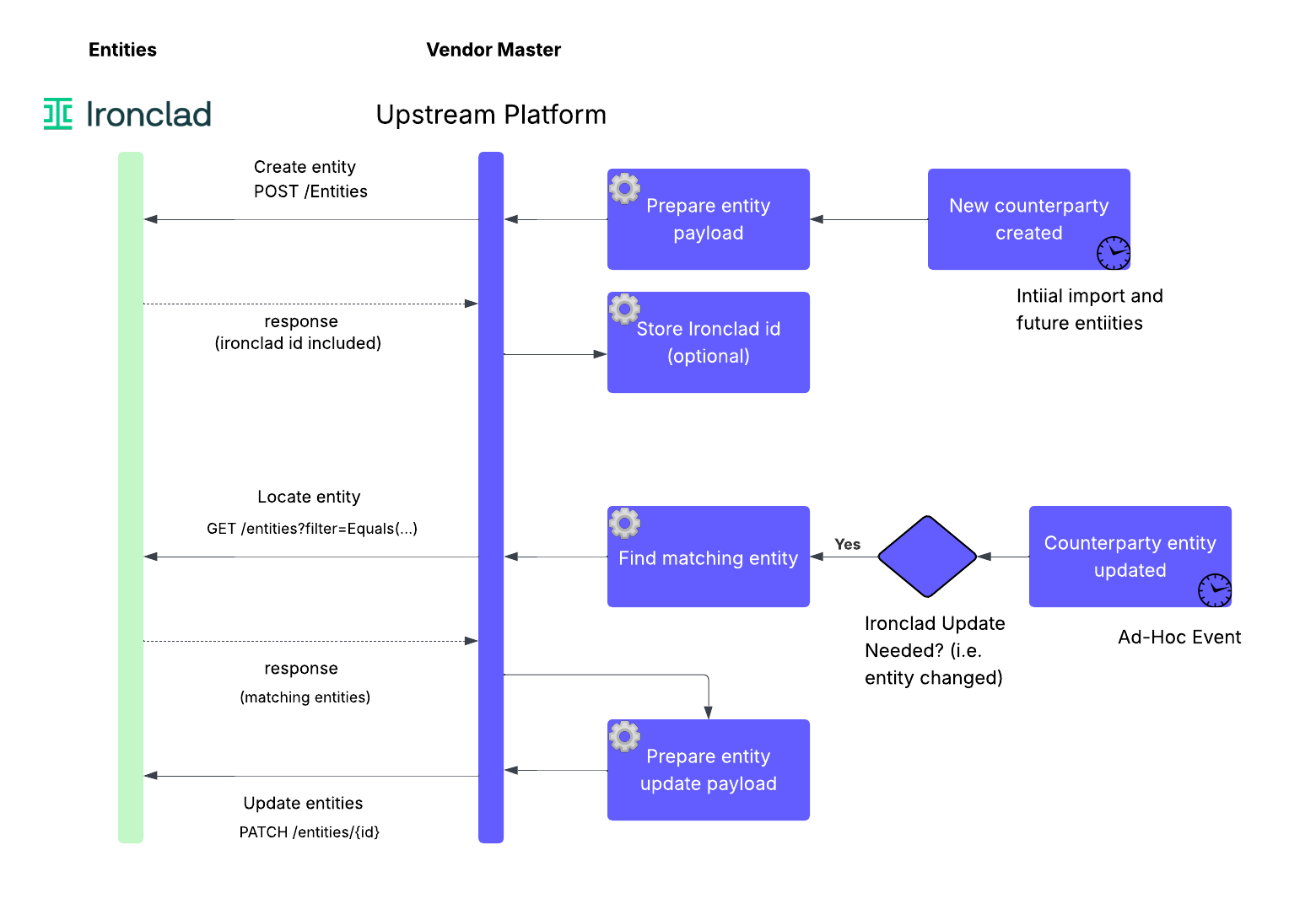 The integration will use Ironclad's public API to create and update entities. There are three key integration points involved: