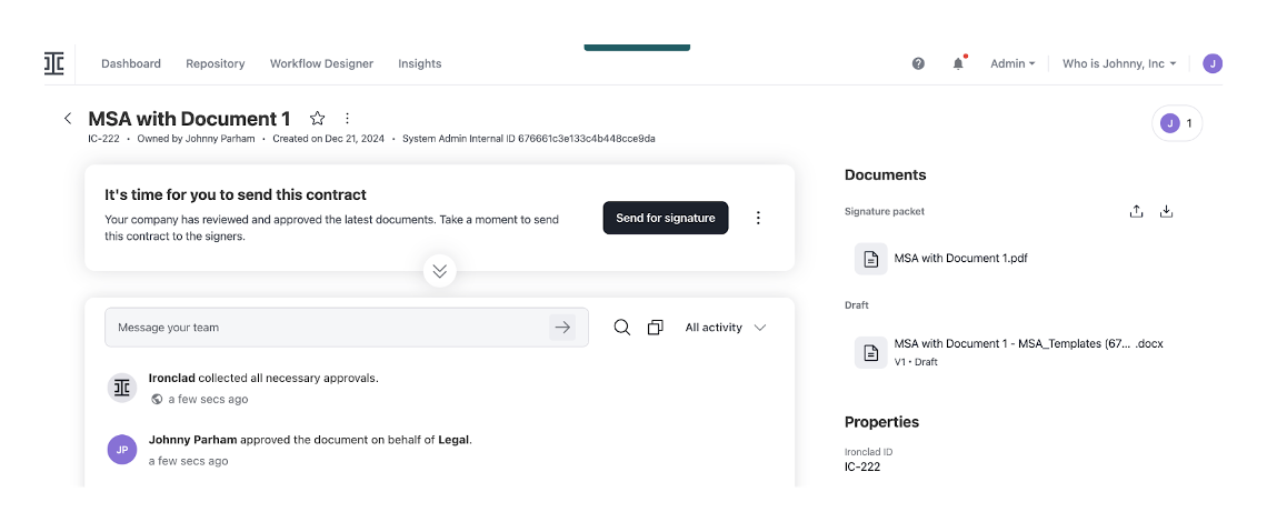 Workflow: In this example, the workflow that we’ll approve is IC-222: MSA with Document 1.