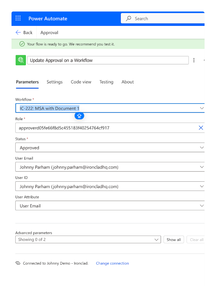 Approval Update in Ironclad: The required parameters to update a workflow approval are Workflow ID, Role ID and Status. Retrieving these parameters will require custom values to align the corresponding workflows with the correct users. We’ll walk through the parameters based on the Dynamic Content that is provided by the connector.