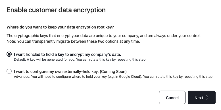 Per-Tenant Encryption PricingThe Per-Tenant Encryption feature is part of the paid Security & Data Pro add-on. Contact your Ironclad account representative for more information about purchasing this package.