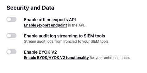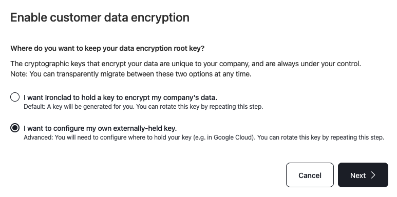 Per-Tenant Encryption PricingThe Per-Tenant Encryption feature is part of the paid Security & Data Pro add-on. Contact your Ironclad account representative for more information about purchasing this package.