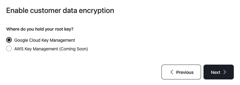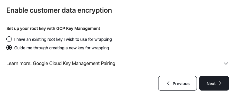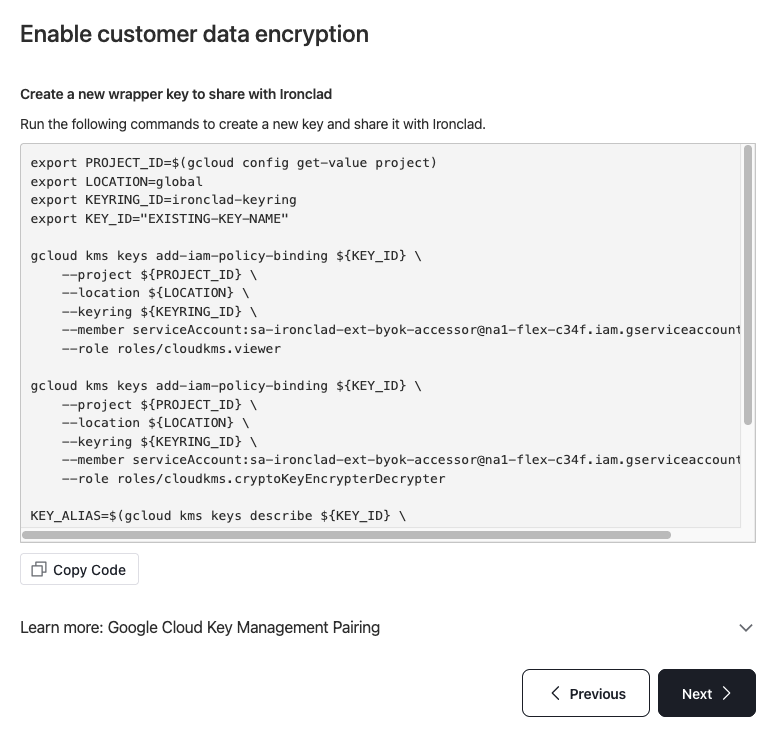 Select Google Cloud Key Management and then select on Guide me through creating a new key for wrapping. Click next to view and copy the configuration code that you will have to run on GCP cloud shell.